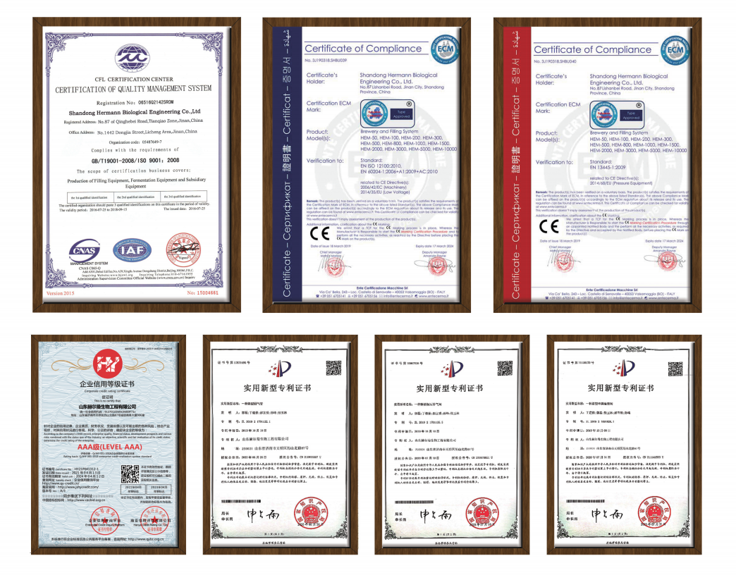 創(chuàng)新是一個企業(yè)發(fā)展的靈魂!匯冠公司非常注重技術研發(fā),已通過高新技術企業(yè)認定,擁有ISO 9001:2008質量體系國際認證、CE認證、UL認證、SGS認證。依靠自主創(chuàng)新,填補多項國內空白其發(fā)明專利40余項,國際認證專利19余項,不僅是中國輕工機械協(xié)會理事單位,還是中國輕工機械行業(yè)精釀啤酒釀造裝備十強企業(yè)。